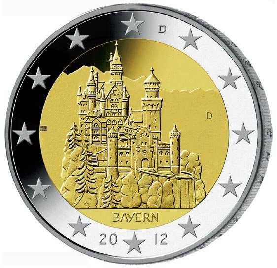 Moneda 2 euros Alemania 2012. Bayern. Juego 5 cecas (A,D,G,F,J)