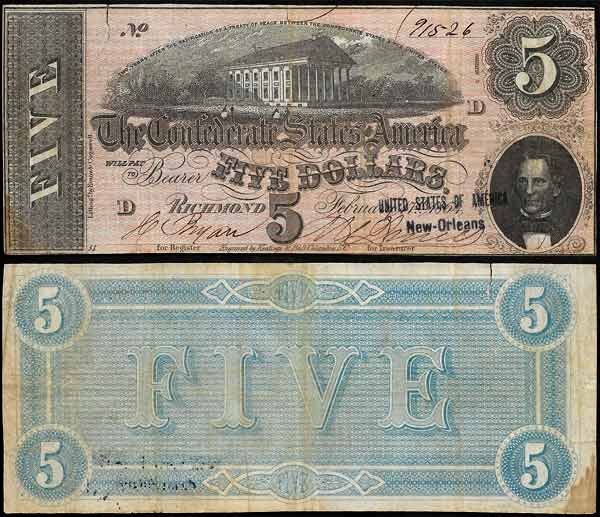Billete Estados Unidos (Confederacion) 005 Dolar 1864 MBC Rotura